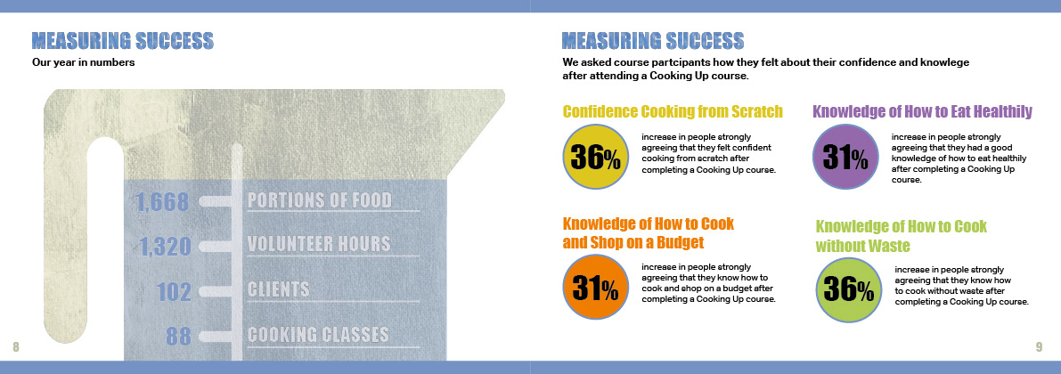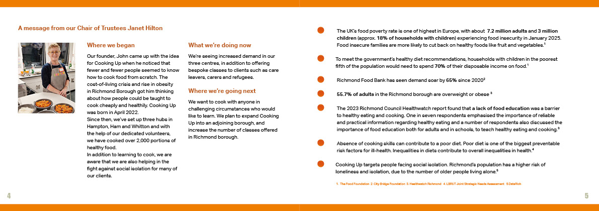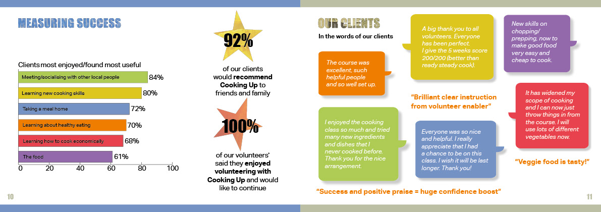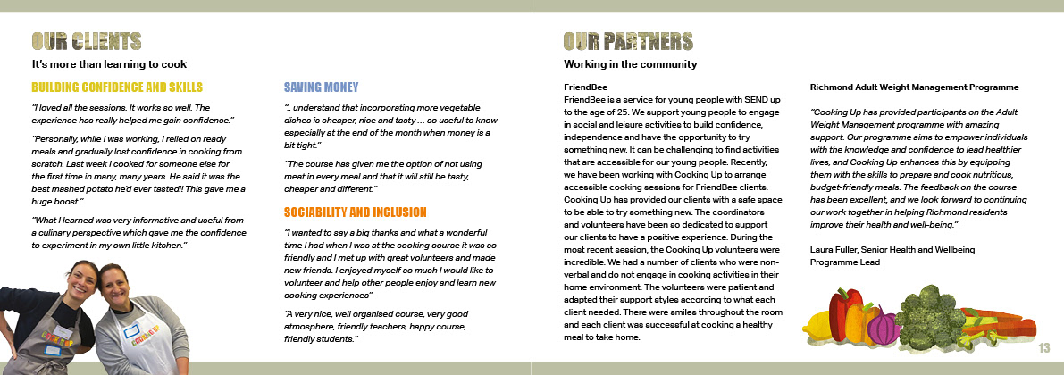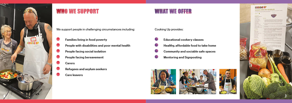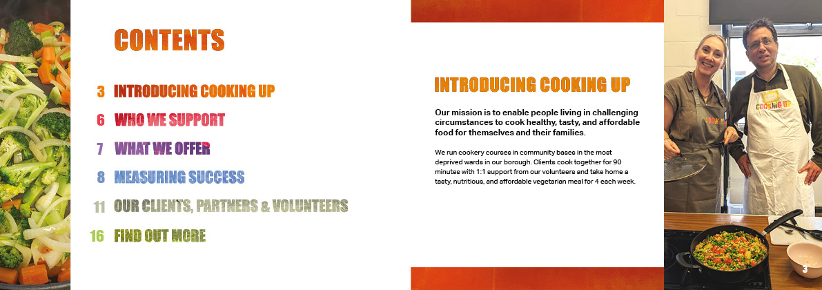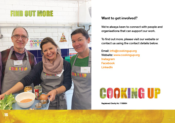 I created the branding, website and print collateral for Cooking Up, a charity whose mission is to teach people in food poverty how to make cheap and nutritious meals. I devised a series of illustrations and edible colour palette for use across all their materials.