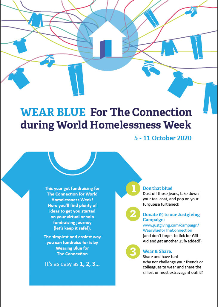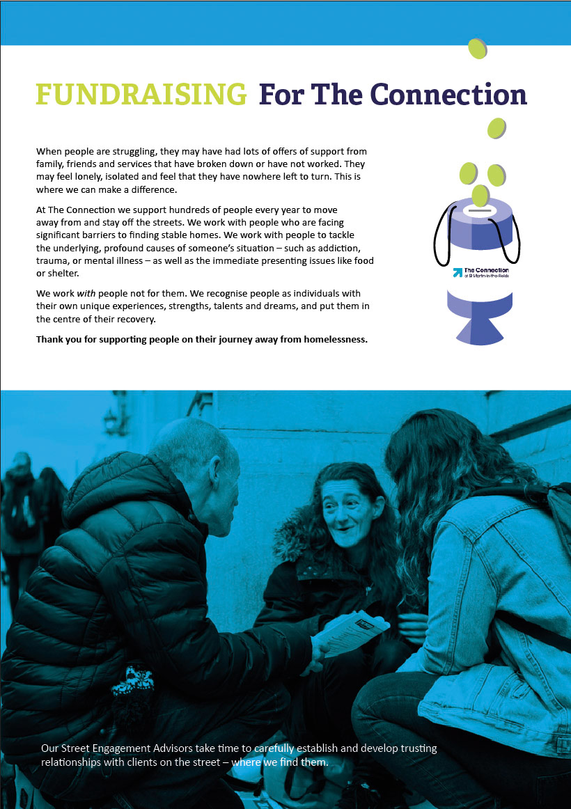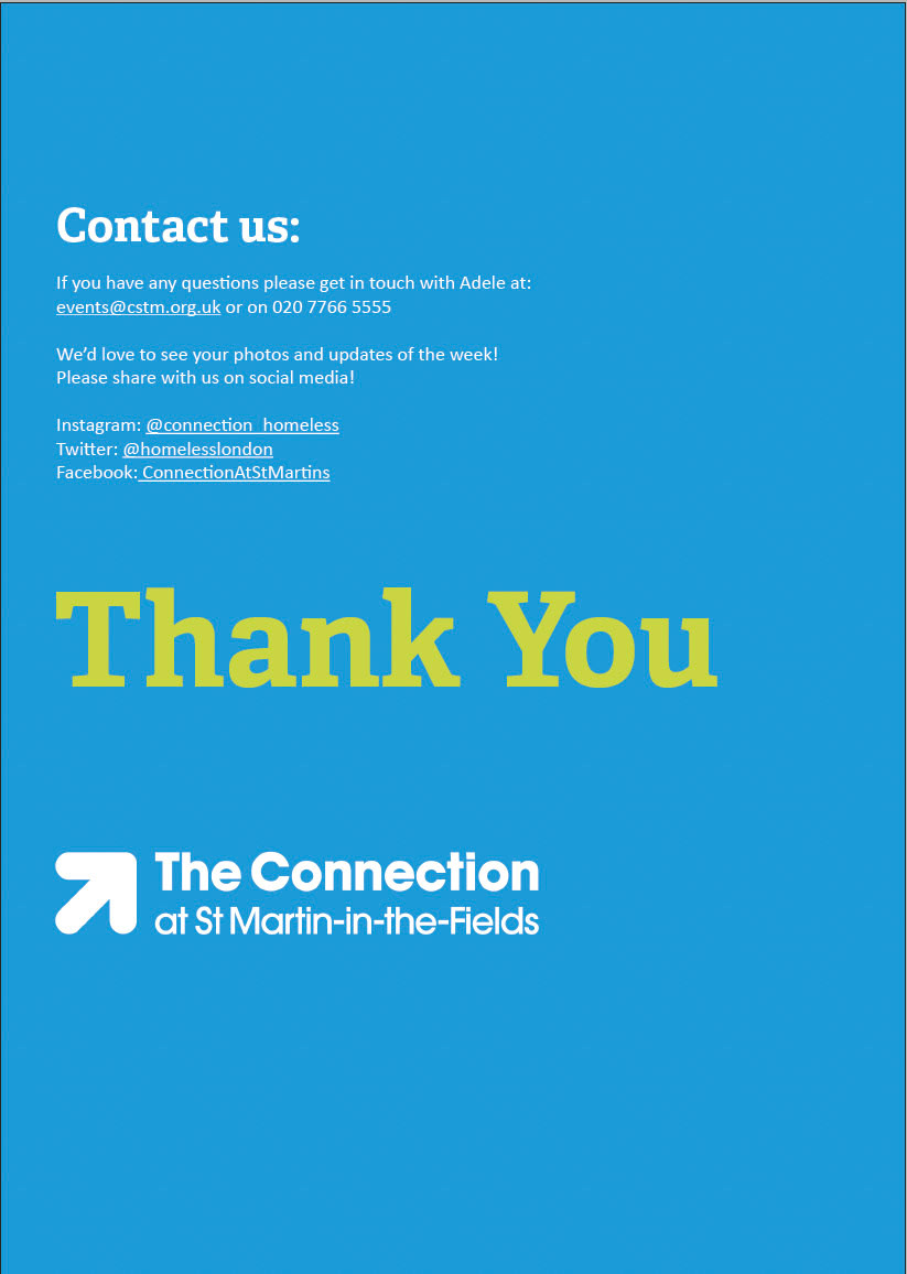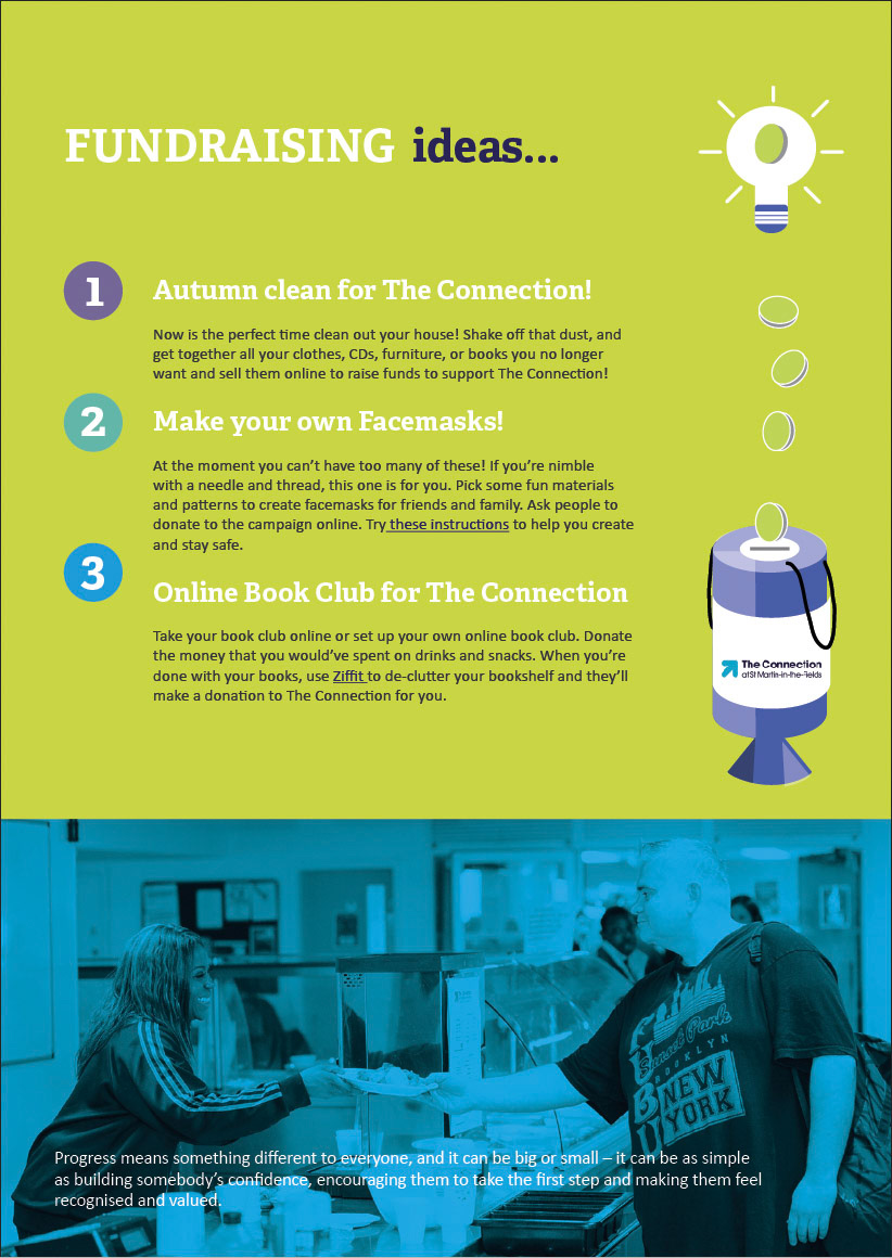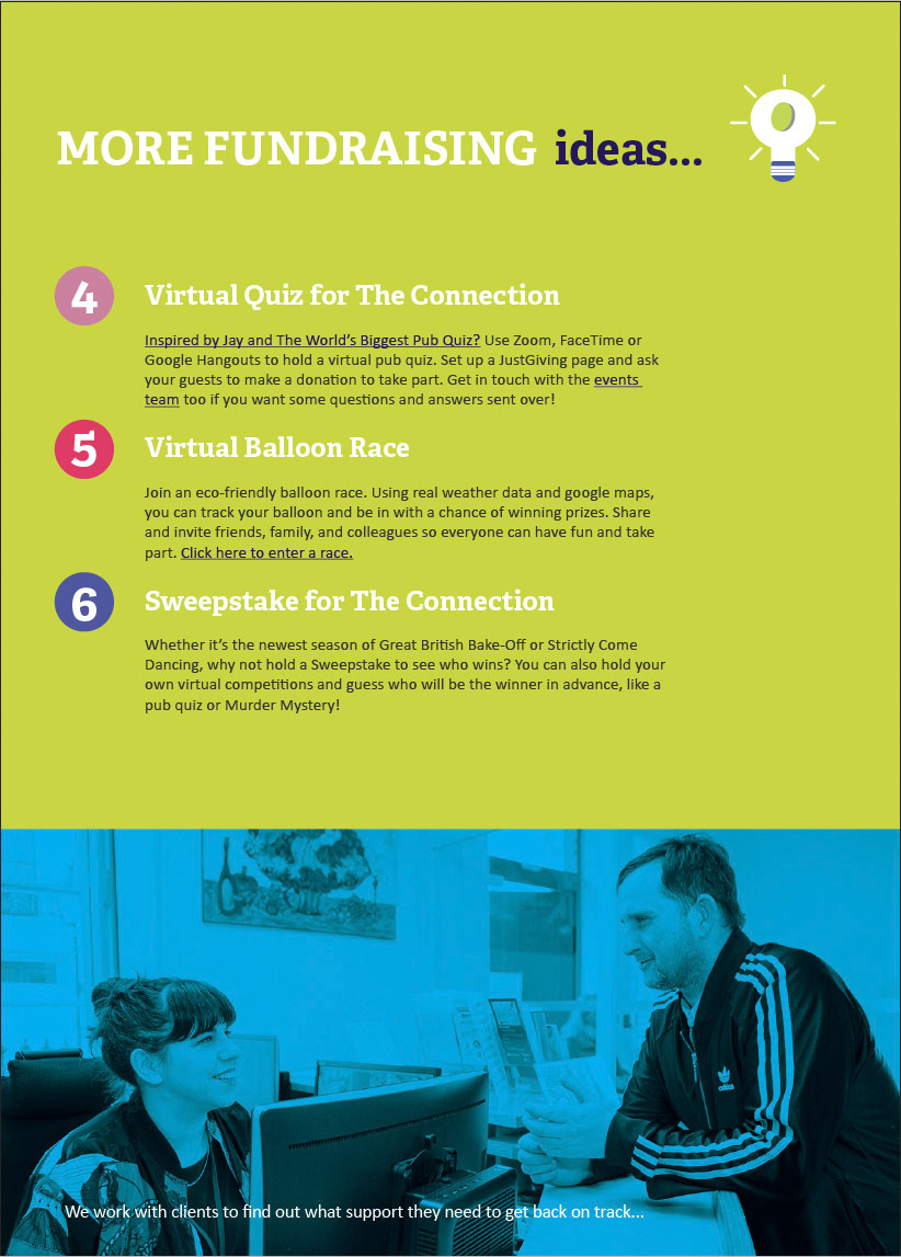 A digital fundraising pack for the homeless charity, The Connection. This document was sent out to give supporters ideas about how to raise money in innovative ways during the pandemic.